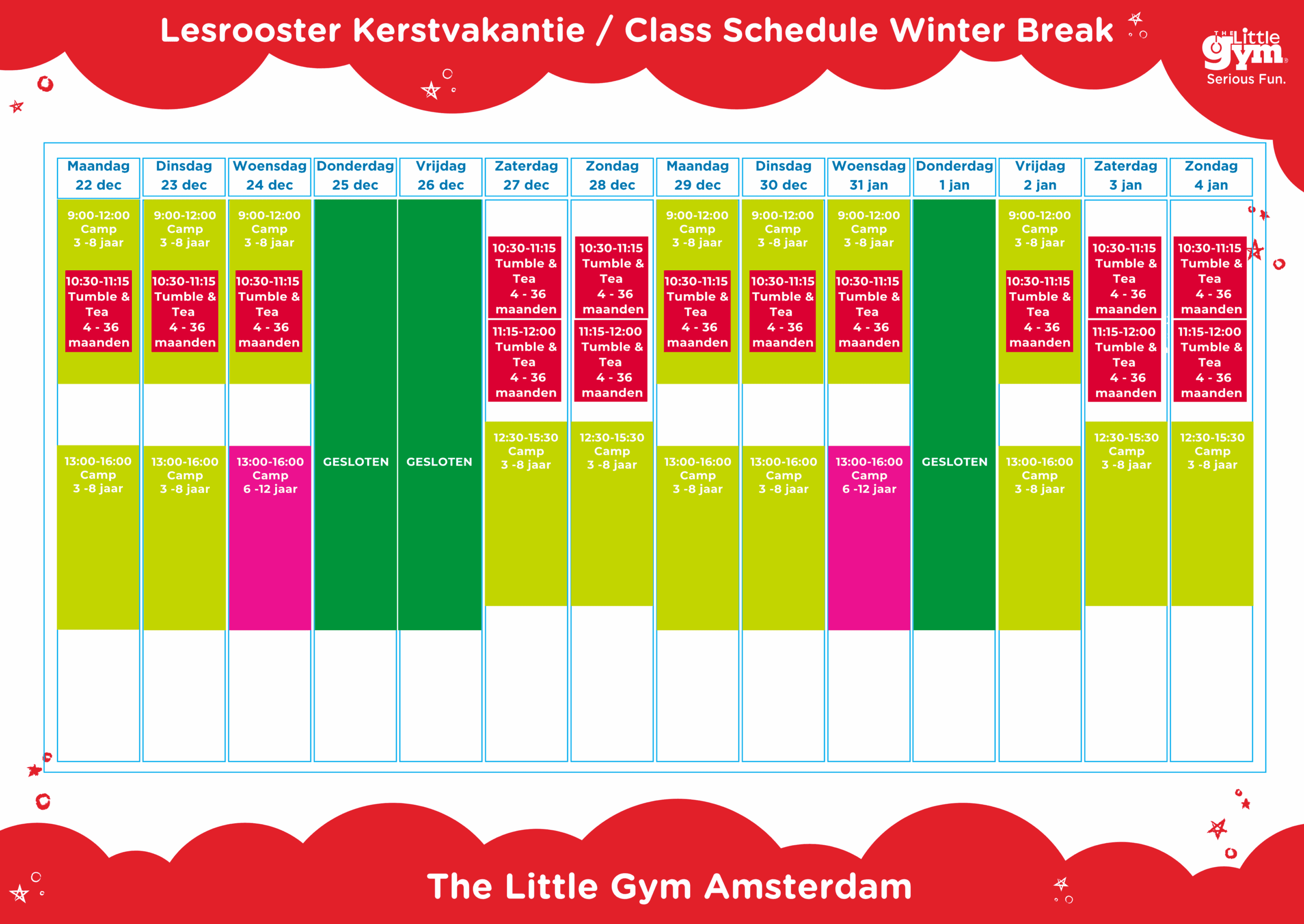 €90 per maand inclusief vakantieactiviteiten zoals Tumble & Tea, Practice Time en Camps. Inschrijfgeld €35 (eenmalig).